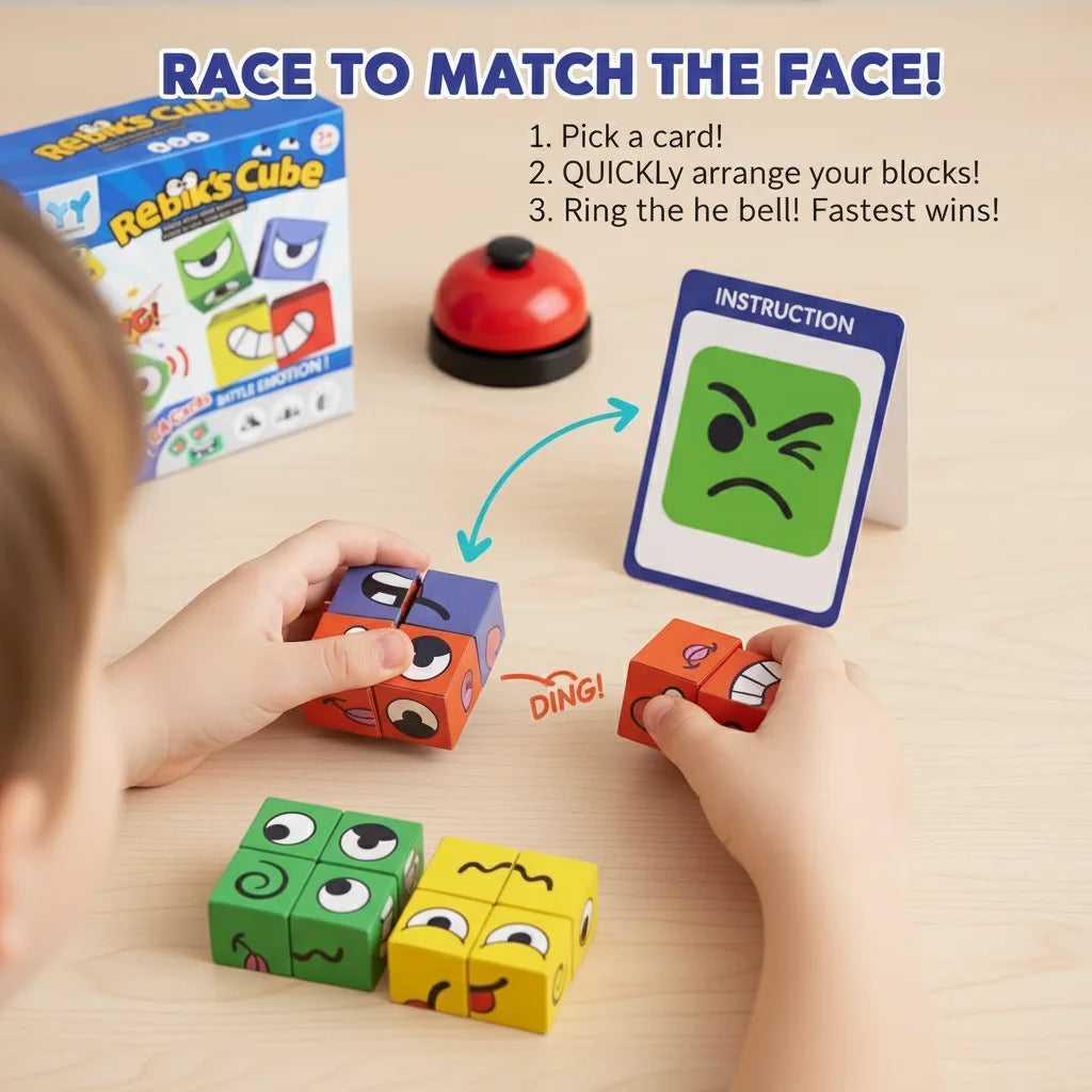 It’s a fast-paced matching game where players rotate mini cubes to recreate the facial expression shown on the card. The first player to finish hits the bell and wins the round.
